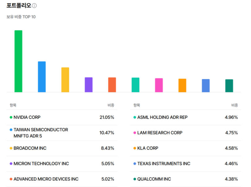 상위 보유 종목에는 엔비디아, TSMC, 브로드컴, 마이크론 테크놀로지, AMD가 포진해 있고,