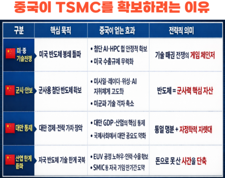 만약 중국이 TSMC를 통제할 수 있는 상황이 온다면, 미국의 반도체 제재는 의미가 크게 약화될 수 있고, AI·군사·슈퍼컴퓨터 분야에서 판도가 달라질 가능성도 배제할 수 없습니다. 이 때문에 미국 입장에서는 절대 양보할 수 없는 선이 대만입니다.